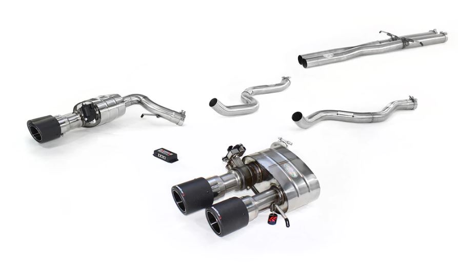 The QuickSilver Exhaust comprises 3 key ingredients: Active Valve rear sections with carbon tips, non-resonated X-Pipe and Sound Architect valve control. The culmination is a robust V8 tone, massive improvement in volume and the autonomy to control the valves without interference from the car.